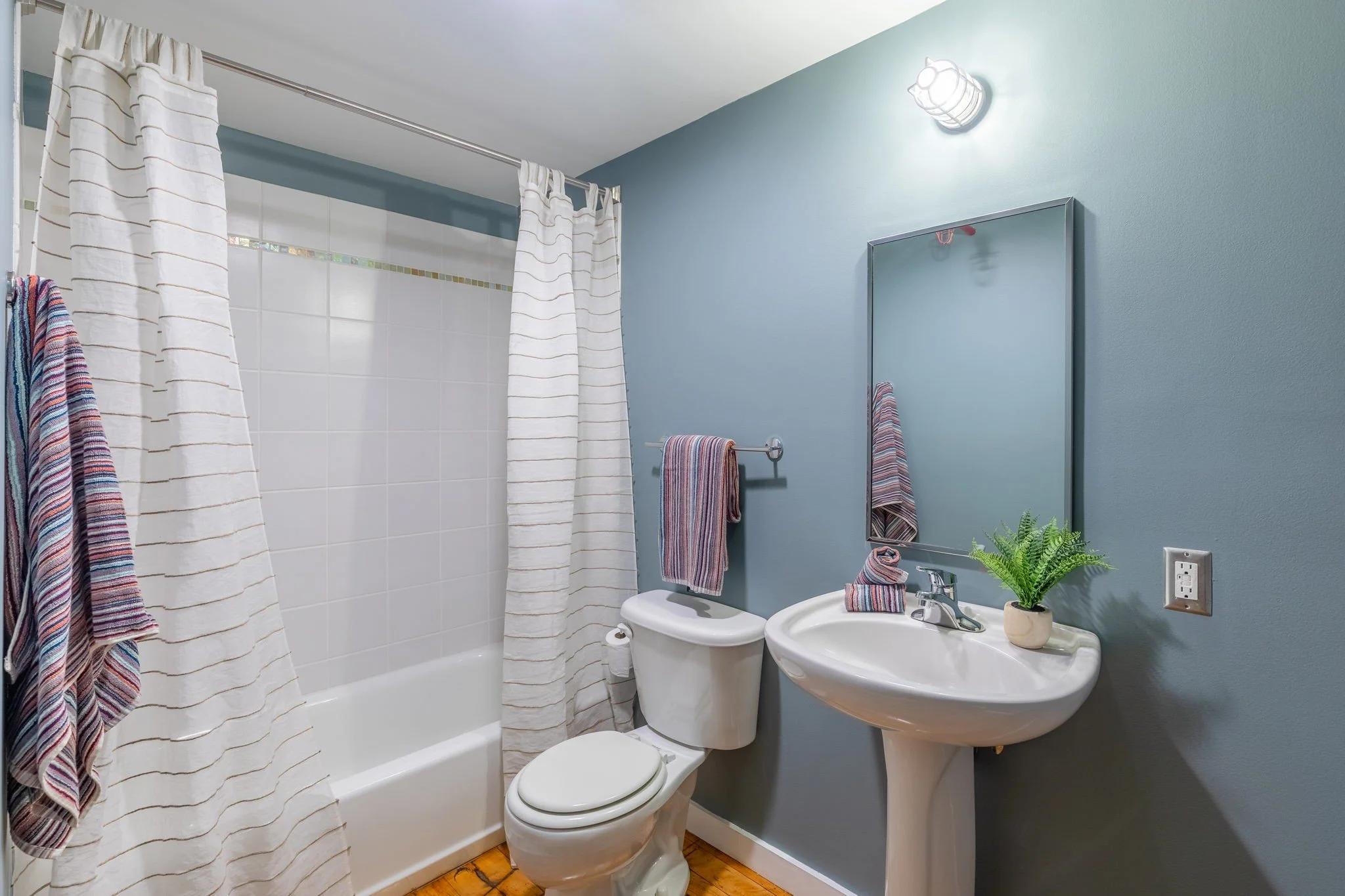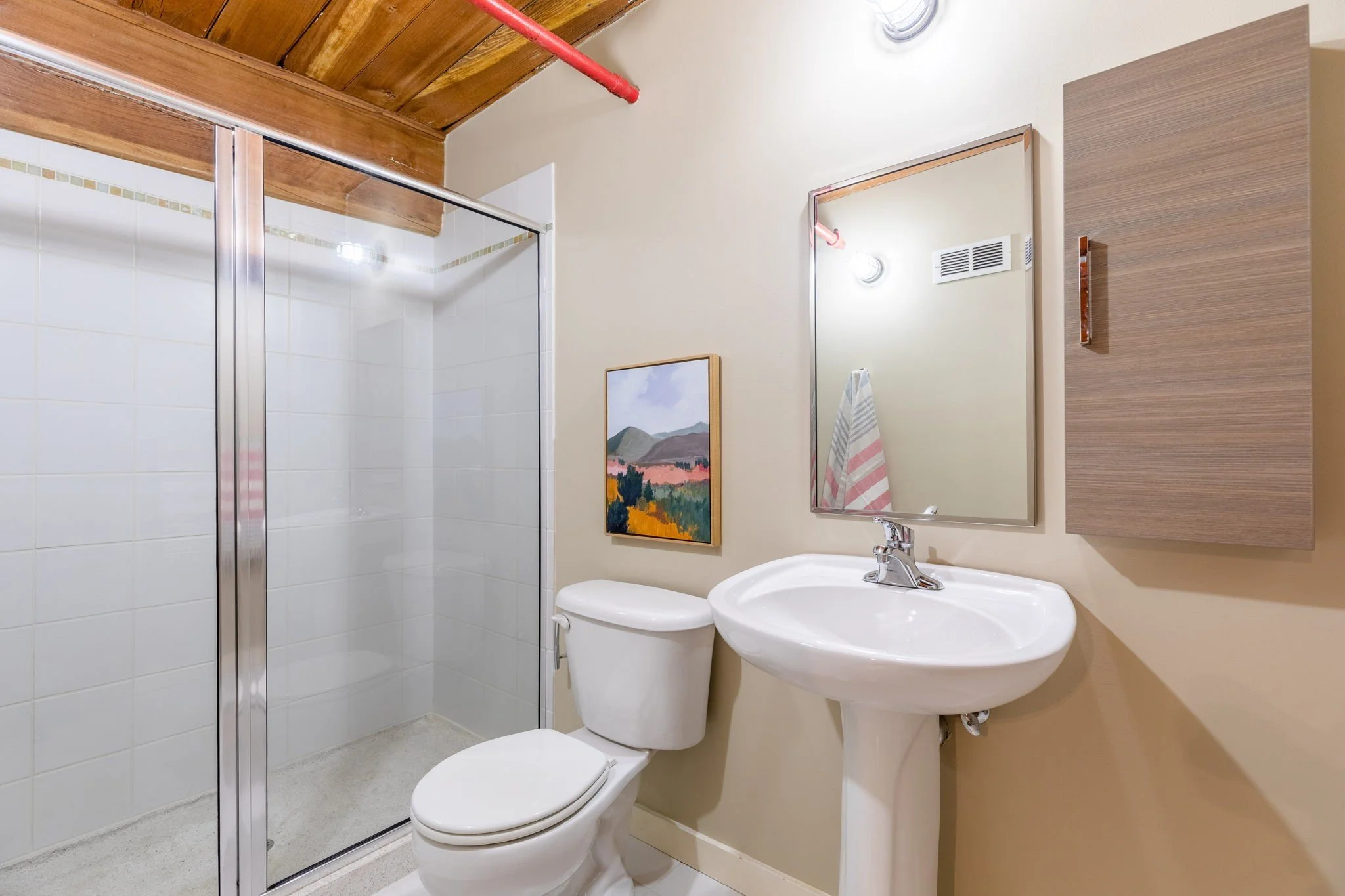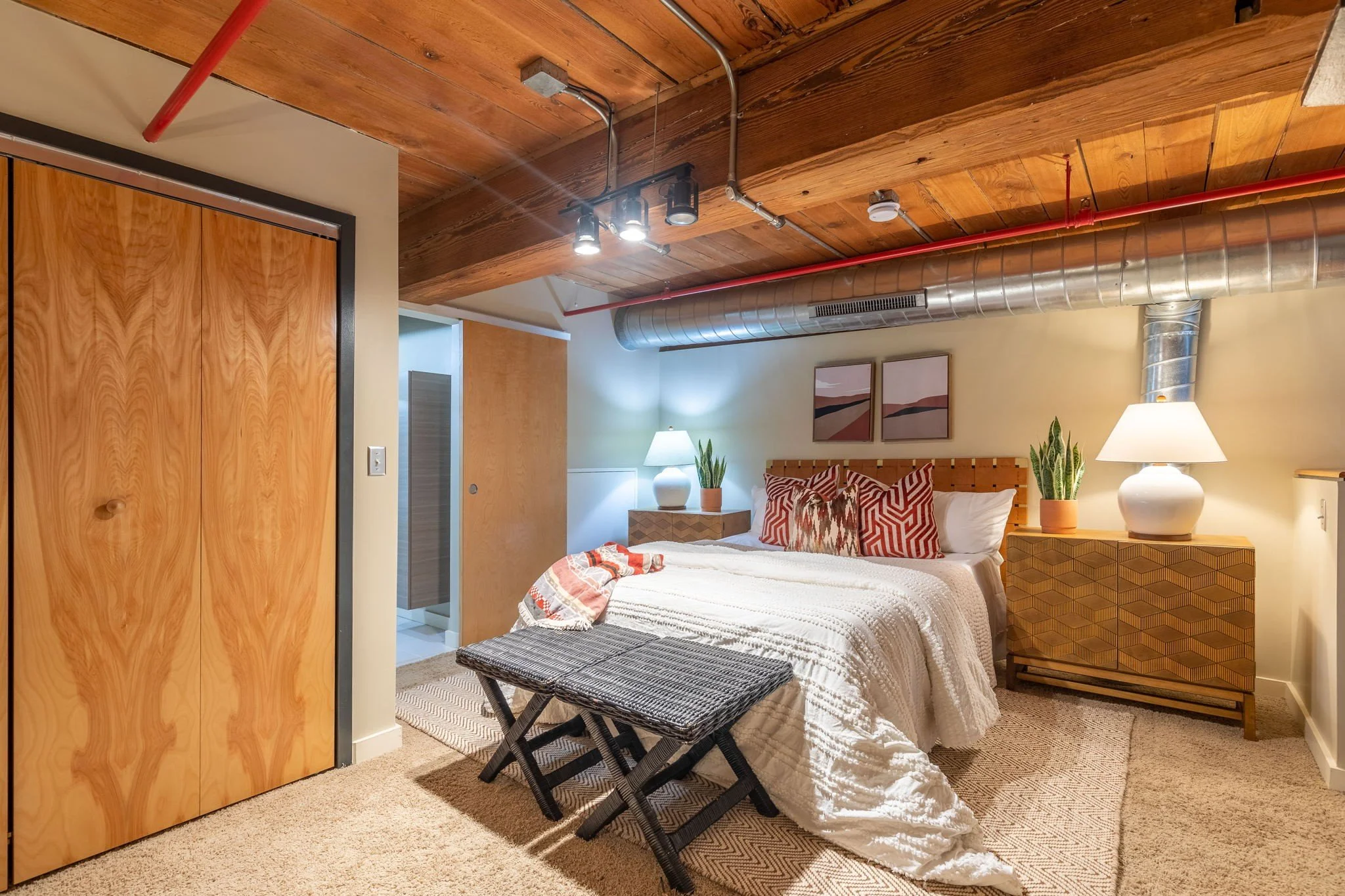 For the primary suite on the second floor we ripped up the carpet and added reclaimed barn wood floors stained to match the original factory floors from the first level. We removed a portion of the wall to open up the space and bring in more natural light from the large original windows. The primary closet was reimagined with new built-ins and the bathroom was completely gutted. The primary bath now has a new extended shower, a beautiful floating wood vanity and new finishes throughout.