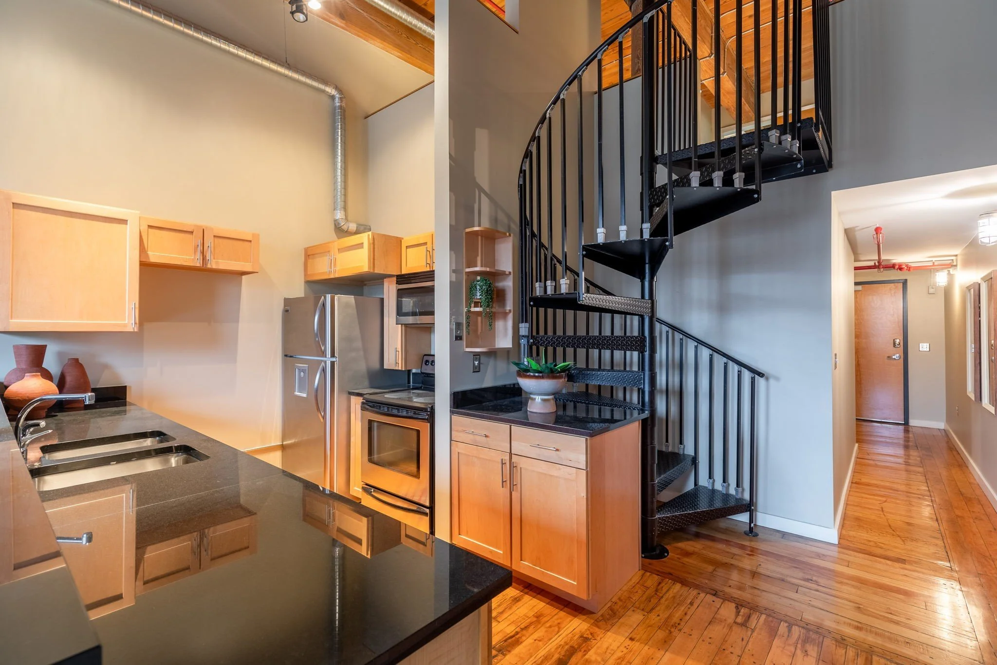 In the main living space we maintained the original factory floors and brick walls. We removed large cabinets that broke up the flow of the entryway/kitchen/living room and completely reimagined the layout of the kitchen. What was once a small peninsula kitchen is now a large U-shape kitchen that uses every available square foot. We utilized the height in the space with tall upper cabinets and connected the kitchen to the living room with a counter height dining space capped off with a gorgeous quartz waterfall.